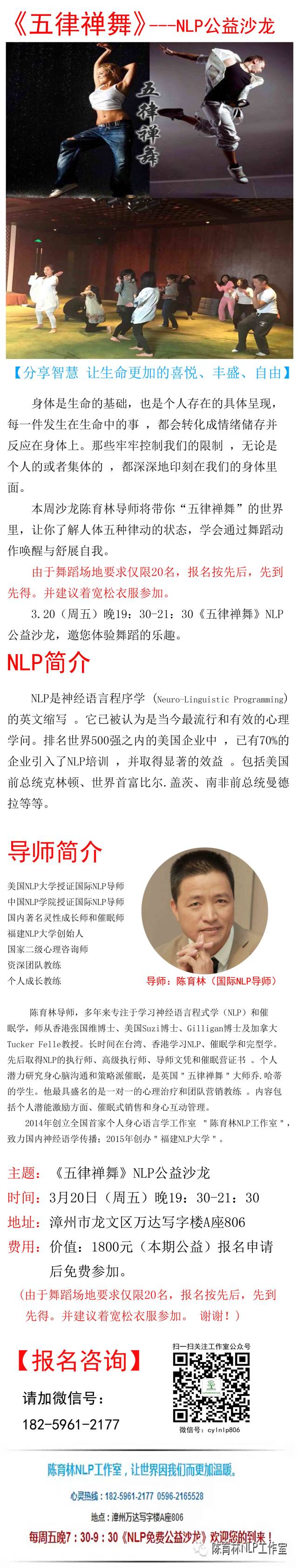 3.20(周五)晚19:30-21:30《五律禅舞》NLP公益沙龙,邀您体验舞蹈的乐趣。