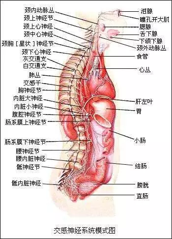 我们先来看看交感神经的位置,它位于脊柱的两侧。如果大家学习过NLP的EMBA理论,你就能知道每个生理状况都对应一个心理状态。如果你挺直腰,挺胸抬头,昂首阔步,你就是想沮丧都难。这就是交感神经在起作用。我们再来说到肾上腺素,人体正常情况下,功能相反的交感和副交感神经处于相互平衡制约中。当人体处于运动状态时,骨骼机的肌糖分解为葡萄糖,肌肉力量变大,人体对外可用的能量大增。这时候人瞬间能力大增,意识敏锐,反应迅速,这就是NLP里所强调的身心一致的最佳状态。如果用NLP来探索人类身心健康是最好不过了,这就是我常跟朋友和学员讲的,如果你学会并懂得运用执行师课程中ABC法则和EMBA理论,这一生就可以永葆乐观与健康。